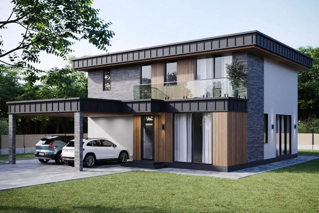 This elegant two-storey modern home features clean lines, panoramic glazing, and a minimalist façade combining light plaster, warm wood panels, and graphite metal accents. The layout is optimized for comfort and functionality, perfectly suited for a family of 4–6 people.