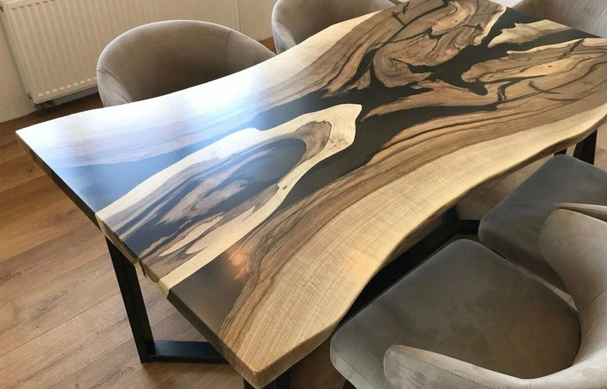 Resin color, wood type (colored ash, white ash, or ash core), table dimensions, and leg design can be customized upon request.